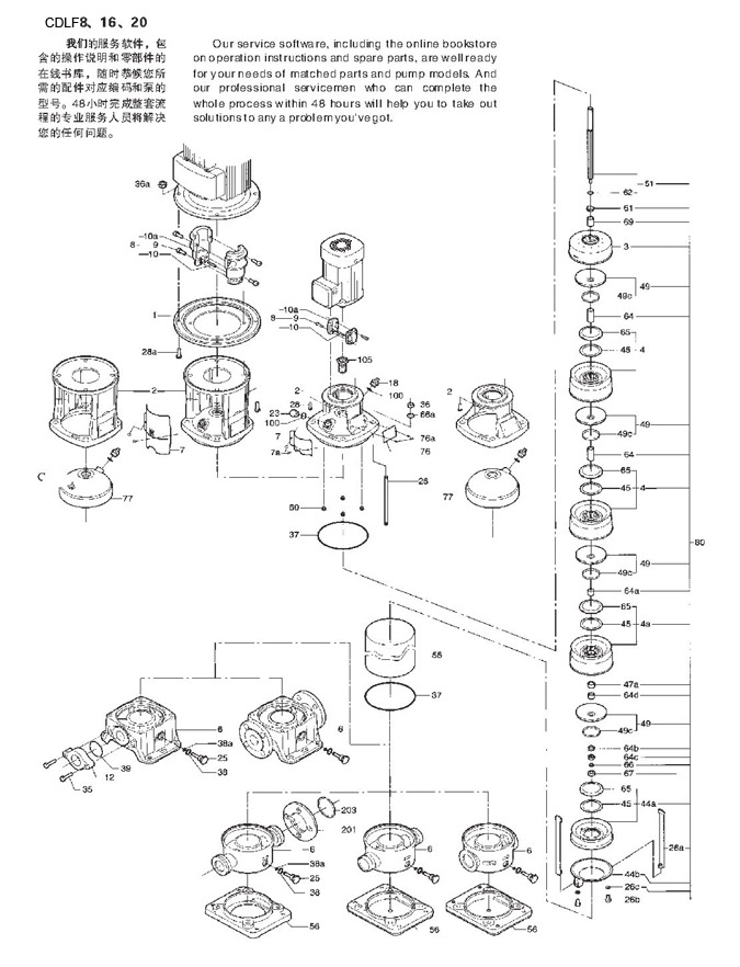 CDLF為安裝標(biāo)準(zhǔn)電機(jī)的非自吸立式多級(jí)離心泵,電機(jī)軸通過泵頭用聯(lián)軸器直接與泵軸聯(lián)接,拉桿螺栓將耐壓筒、過流部件固定在泵頭和進(jìn)出水段之間,泵進(jìn)出水口在泵底同一直線上;本泵可根據(jù)需要配置智能保護(hù)器,對(duì)泵干轉(zhuǎn)\缺相\過載等進(jìn)行有效保護(hù)。